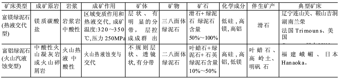 国外绿泥石主要产出国有美国、法国、新西兰、加拿大、日本、俄罗斯。我国富镁绿泥石矿资源主要分布于辽东半岛、胶东半岛、广西滑石矿产区,此外,湖南城步兰荣也有分布。属于热液交代型绿泥石,在地质成矿环境和时空分布上常与滑石矿有紧密关系。绿泥石矿体与滑石矿体伴生,两者之间常有过渡变化,其矿物组合最简单,绿泥石主要为鳞片状淡斜绿泥石、叶绿泥石、蠕绿泥石。伴生矿物滑石、菱镁矿、白云石和石英等。我国富铝绿泥石类型仅见于福建峨嵋。别的地方的富铝绿泥石矿床尚未发现。